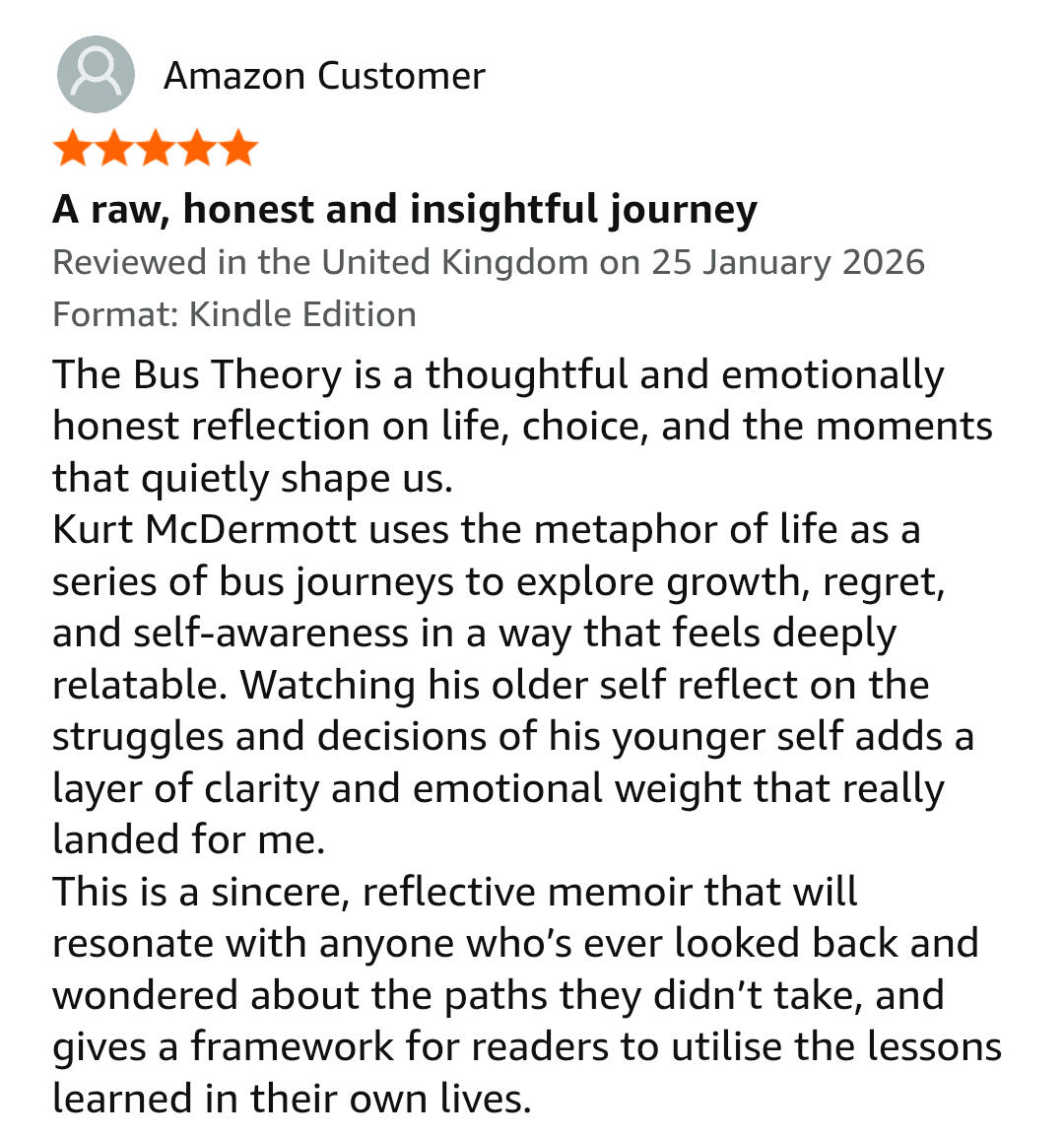 Engineer by trade.Father. School Governor. Writer.Kurt’s work explores the darker corners of adversity — the quiet moments of doubt, anxiety, and internal conflict that many people experience but rarely articulate.His debut book, The Bus Theory, blends psychological tension with personal reflection, offering a story-driven exploration of resilience, direction, and the human capacity to rebuild.Grounded in community and lived experience, his aim is simple: to help people feel less alone during difficult seasons.
